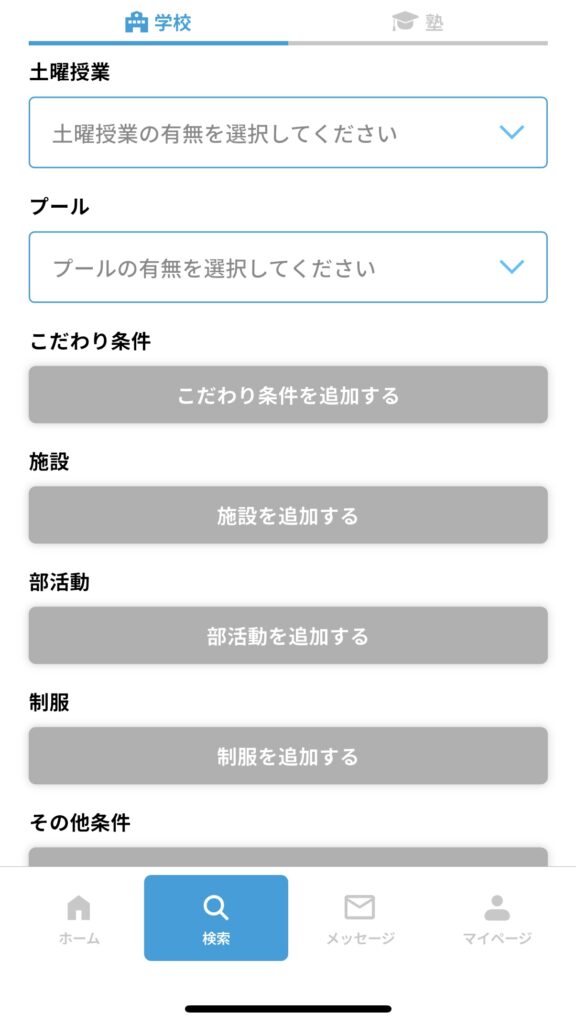 制服の特徴を男女別に選択して、学校を検索することができます。私服がいい!セーラー服がいい!など、服装が学校選びの基準になっているご家庭にはこのアプリを強くオススメします。ここまで多種多様な絞り込みができるサイトは見たことがないので、我が家でも重宝しています。